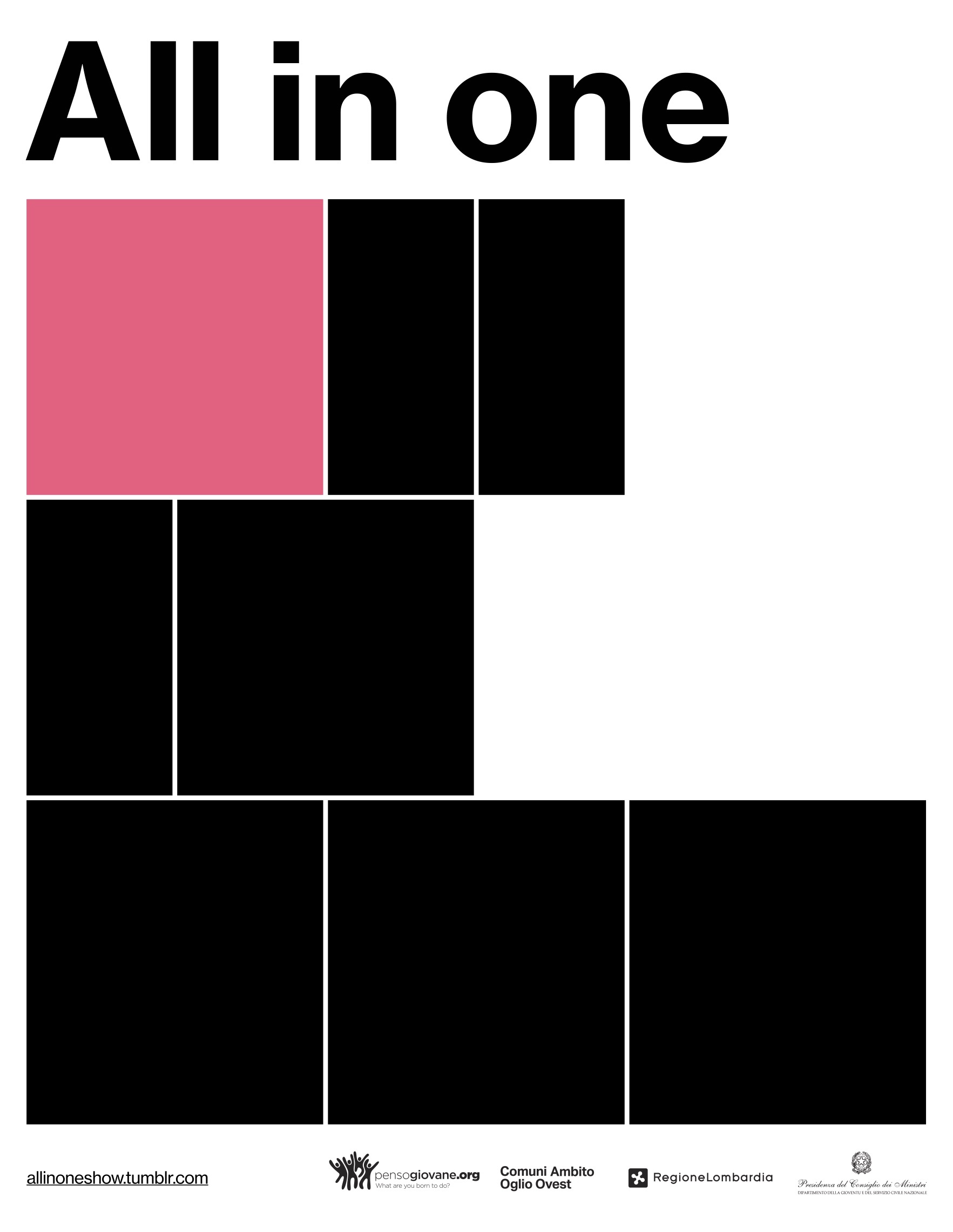 All in one, a projected-only loop group show intende presentare al pubblico lavori video di decine di artisti provenienti da tutto il mondo. Il progetto nasce in accordo con il Piano Distrettuale Oglio Ovest e Rete Giovani per lo sviluppo del Pensogiovane, piattaforma legata all’iniziativa giovanile.